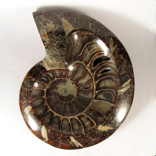 The center of this Ammonite fossil has been carved out creating a shallow dish! This awesome and unique dish has warm brown and yellow calcite. You can see intricate suture patterns on the sides and bottom of this dish. There is evven a couple open chambers with crystals inside!