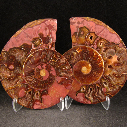 Much of the inside of this Ammonite Pair has been replaced with a pinkish colored red jasper! The rest of it has super dark calcite!