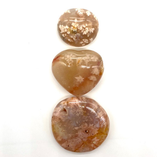 This triple Flower Agate set is intended to be used for those who are working on integration of Maiden, Mother, Elder aspects of the self. Place the larger palmstone over the womb (Mother), the heart on the heart (Maiden), and the smaller pebble on the 3rd Eye (Elder) during meditation or while falling asleep. The set is intended to assist in the deeper connection and alignment of these three energy centers and their symbolic connection to the 3 stages of female wisdom. It is especially useful to use this set to support intense healing and shadow work that seeks to bring maiden aspects of the self in touch with aspects that are older and wiser in order to internally process, heal, and reintegrate dissociated pieces of self.