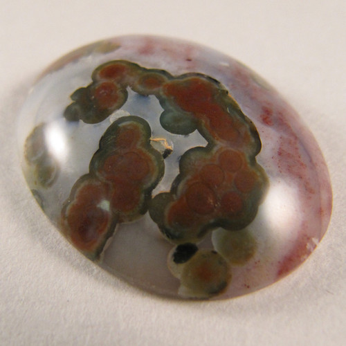 This Ocean Jasper cabochon measures approximately 40mm X 30 mm and weighs approximately 0.03 lbs. It has green, brown, and reddish orbs, floating in a translucent background of misty white to reddish purple chalcedony. There are a few small nicks on the bottom, along the edge.