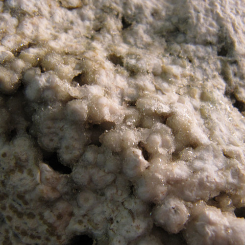 This large piece of Ocean JasperTM  rough measures approximately 6 3/4" X 4 1/4" X 7 1/4" and weighs approximately 8.58 lbs.   One side of the piece is entirely covered in small translucent spheres, brown to golden yellow in color.  It is surrounded by translucent chalcedony, with brown and white orbs.  The rest of the piece is white, green, and gold, with a few pockets of pale green druzy quartz crystals.