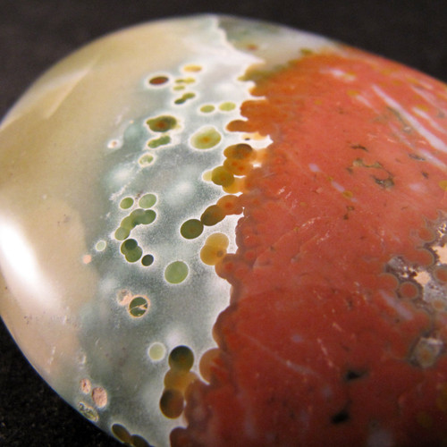 This pebble measures approximately 3/4" X 2 3/4" X 2 1/4" and weighs approximately 0.27 lbs. It has two distinct color palettes. One side is more opaque, with closely packed reddish pink and mustard yellow orbs. The other is more translucent, with more randomly spaced orbs in cooler colors like green and off white, with red centers. Almost all Ocean Jasper has natural fractures, due to the brittle nature of chalcedony. There is a large one across one third of the pebble and a few smaller ones.
