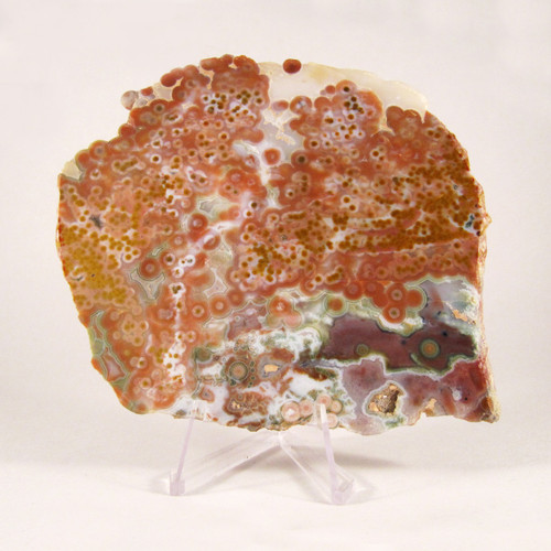 This gorgeous Ocean Jasper Slab is speckled with pink and orange orbs with splashes of purple, green, and white. There are pockets of sparkling druzy and some botryoidal orbs along the edges.