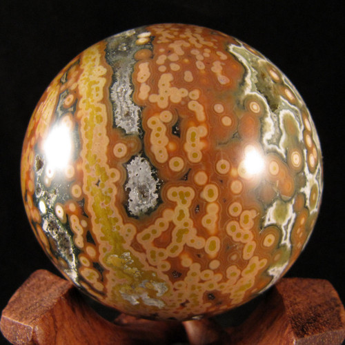 WOW! This gorgeous Ocean Jasper Sphere as pinky peach orbs. As you spin the sphere around, you see the orbs change color and turn into an yellowish orange spotted orbs. This piece of Ocean Jasper has light green druzy crystals! And there is even some purple coloring in this one! There is also a small area that is semi translucent!