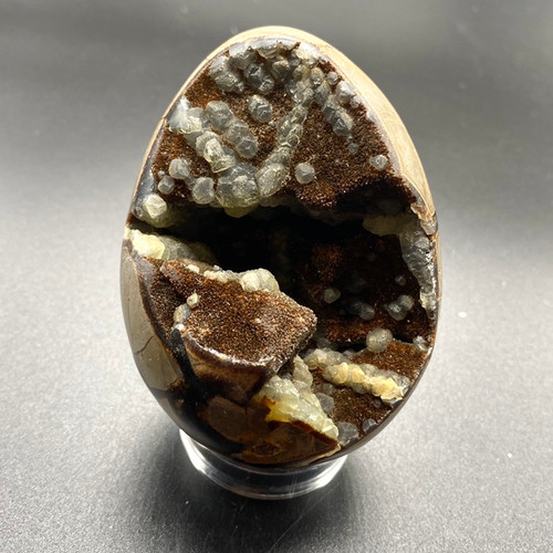 The eggs do need some kind of a stand if you want to display them. We do sell plastic stands on the website, but vintage napkin ring holders also look fantastic as sphere and egg stands. I've seen Laurel, our talented display artist for the store, use black aquarium gravel to nuzzle septarian eggs into for a dramatic look as well. I think I'd want to put them on a display with an actual nest, some black gravel or sand to stabilize it, and a bunch of tiny dragons snuggled up with it. My style is "Boho Jurassic".