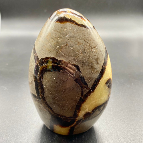 Golden yellow calcite will activate the solar plexus and support you to use your personal will in highest service to your life's goals with positive confidence. If you need to redirect your will to more supportive habits or behavior, yellow calcite supported by the dark aragonite crystals can add a detox of old patterns of behavior with grounding and stabilizing into new patterns. My favorite association with septarians is that even when the conditions of life shatter us, nature has a way of filling us back up beautifully.